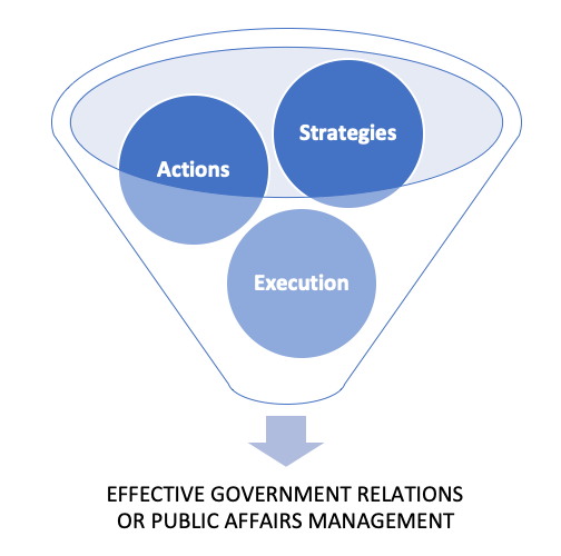 This idea is true. The well-understood policy is the one that is exerted in favor of the best for communities, social and productive sectors, minorities – majorities, democracy, environment, and in general better quality of life and options for a better future for all. This exercise of politics is the virtuous practice and it is the one that occurs daily in the world in a greater proportion, although corrupt politics also but in less quantity. Having said that, let’s talk about the importance of professional and ethical interaction with politics in what has to do with relations with the government and public affairs. My experience has shown me that this work goes beyond meetings or dialogues, however successful they may be. In order for relations with the government and the management of public affairs to be permanently fruitful, they must mix three ingredients: Strategies that consist of three lines, Previous actions in five areas, and Execution in four tasks. Let’s see the recipe in the following figure.